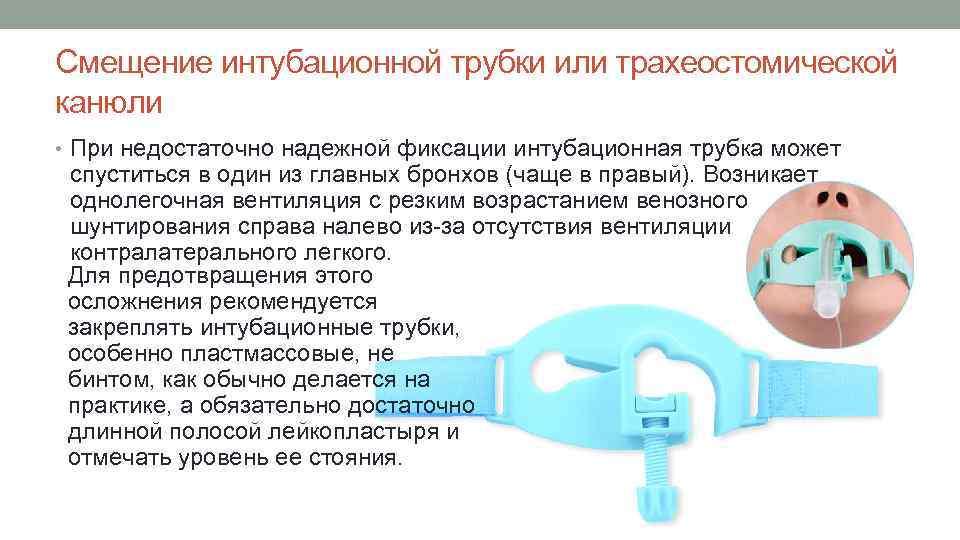 Смещение интубационной трубки или трахеостомической канюли • При недостаточно надежной фиксации интубационная трубка может спуститься в один из главных бронхов (чаще в правый). Возникает однолегочная вентиляция с резким возрастанием венозного шунтирования справа налево из-за отсутствия вентиляции контралатерального легкого. Для предотвращения этого осложнения рекомендуется закреплять интубационные трубки, особенно пластмассовые, не бинтом, как обычно делается на практике, а обязательно достаточно длинной полосой лейкопластыря и отмечать уровень ее стояния.