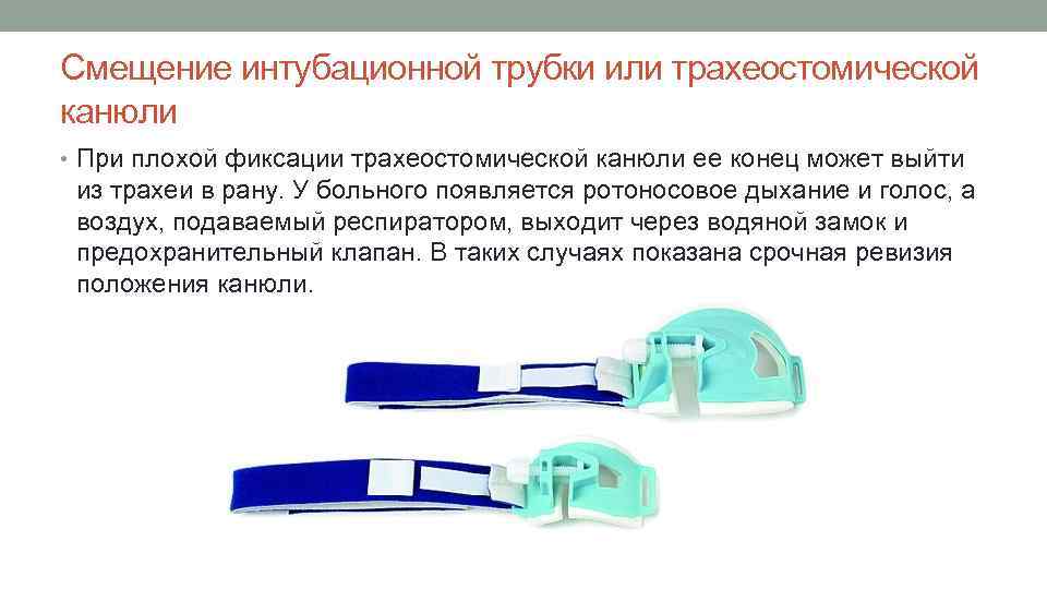 Смещение интубационной трубки или трахеостомической канюли • При плохой фиксации трахеостомической канюли ее конец может выйти из трахеи в рану. У больного появляется ротоносовое дыхание и голос, а воздух, подаваемый респиратором, выходит через водяной замок и предохранительный клапан. В таких случаях показана срочная ревизия положения канюли.