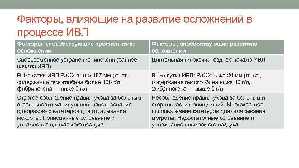 Факторы, влияющие на развитие осложнений в процессе ИВЛ Факторы, способствующие профилактике осложнений Факторы, способствующие развитию осложнений Своевременное устранение гипоксии (раннее начало ИВЛ) Длительная гипоксия: позднее начало ИВЛ В 1 -е сутки ИВЛ Ра. O 2 выше 107 мм рт. ст. , содержание гемоглобина более 136 г/л, фибриногена — ниже 5 г/л В 1 -е сутки ИВЛ: Ра. O 2 ниже 90 мм рт. ст. , содержание гемоглобина ниже 80 г/л, фибриногена — выше 5 г/л Строгое соблюдение правил ухода за больным, стерильности манипуляций, использование одноразовых катетеров для отсасывания мокроты. Полноценные согревание и увлажнение вдыхаемого воздуха Несоблюдение правил ухода за больным и стерильности манипуляций. Многократное использование катетеров для отсасывания мокроты. Недостаточные согревание и увлажнение вдыхаемого воздуха