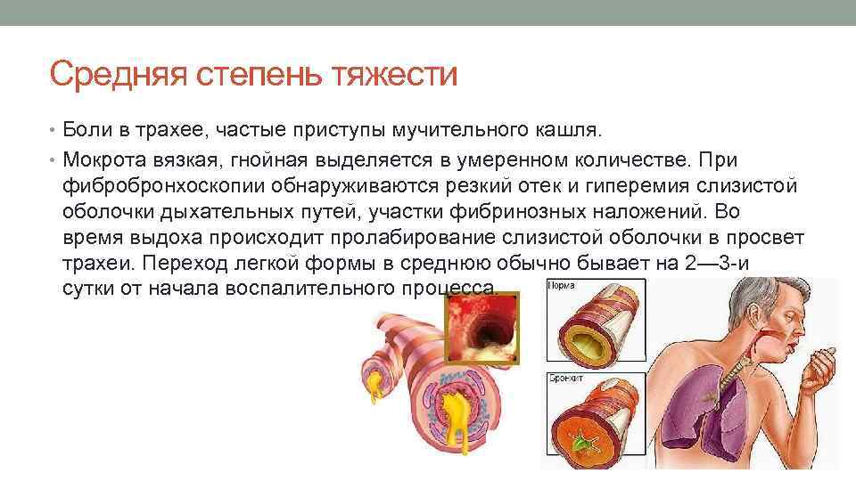 Средняя степень тяжести • Боли в трахее, частые приступы мучительного кашля. • Мокрота вязкая, гнойная выделяется в умеренном количестве. При фибробронхоскопии обнаруживаются резкий отек и гиперемия слизистой оболочки дыхательных путей, участки фибринозных наложений. Во время выдоха происходит пролабирование слизистой оболочки в просвет трахеи. Переход легкой формы в среднюю обычно бывает на 2— 3 -и сутки от начала воспалительного процесса.