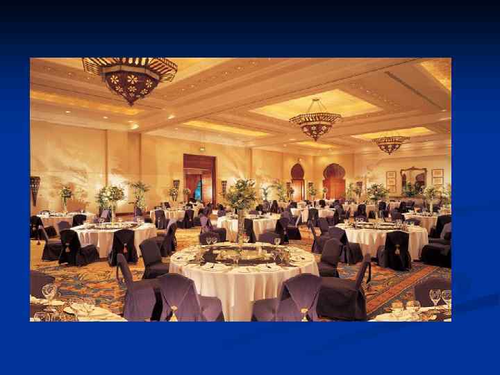 Менеджер несет ответственность за подготовку зала к обслуживанию. n В ходе подготовки и проведения банкета менеджер следит n за подготовкой зала, n сервировкой столов, n обслуживанием гостей официантами и барменами. n