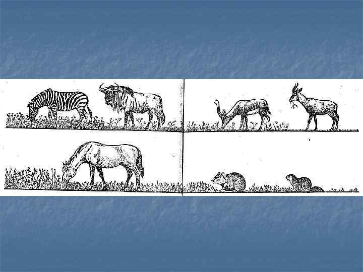 n n n Копытные в саванне – разное использование корма зебра верхушки трав антилопа гну следом газель выщипывает самые низкие травы антилопы топи высокие сухие травы