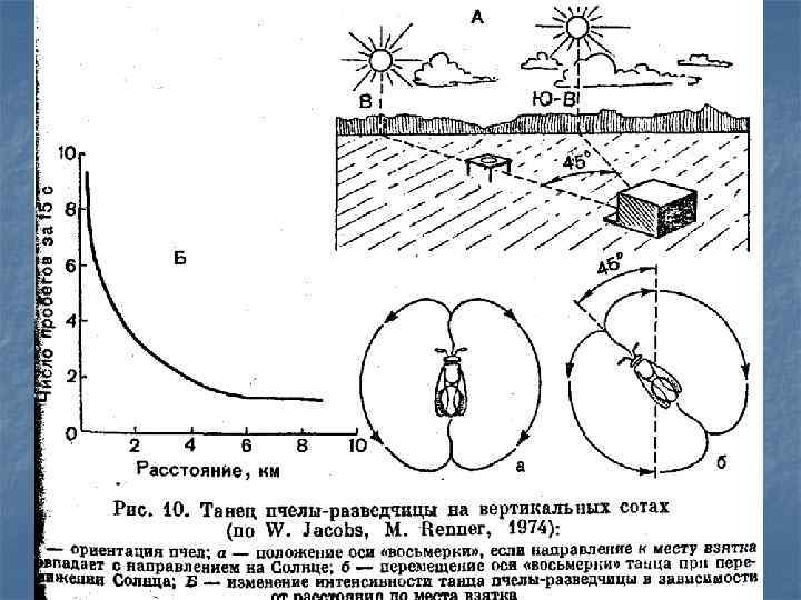 n n n Танец повторяют соседние пчелы, семенят рядом. Более 90 м – «Виляющий» . Круг напоминает восьмерку, во время пробега по срединной линии виляют брюшком. 1) Скорость движения пчелы обратно пропорциональна расстоянию от улья до источника. 2) Угол между средней линии восьмерки и вертикально равен углу между наружным направлением полета и направлением на солнце.