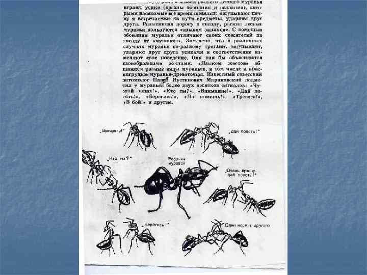 n Мариковский П. подметил у муравьев более двух десятков сигналов: «чужой запах!» , «кто ты? » , «внимание!» , «дай поесть!» , «берегись!» , «на помощь!» , «тревога!» , «в бой!» и другие.
