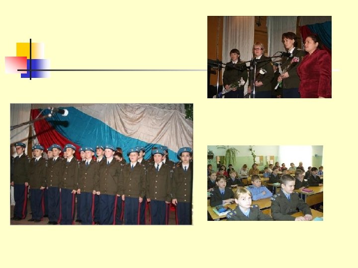 В результате опытно-педагогической деятельности появились новые традиции: • «Праздник школьного содружества» • «Ученик года» • «Девушка года» • «Юноша года» • «Прощание со знаменем» • «Посвящение в кадеты» • «Посвящение в первоклассники» • «Подарок школе» Прощание со знаменем
