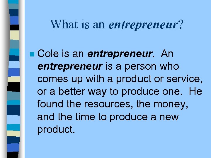 What is an entrepreneur? n Cole is an entrepreneur. An entrepreneur is a person who comes up with a product or service, or a better way to produce one. He found the resources, the money, and the time to produce a new product.