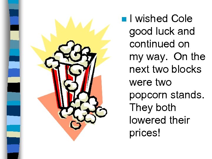 n I wished Cole good luck and continued on my way. On the next two blocks were two popcorn stands. They both lowered their prices!