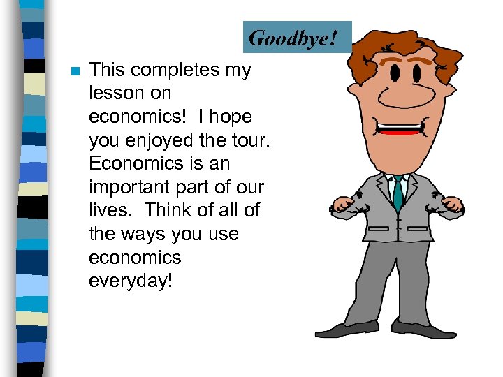Goodbye! n This completes my lesson on economics! I hope you enjoyed the tour. Economics is an important part of our lives. Think of all of the ways you use economics everyday!