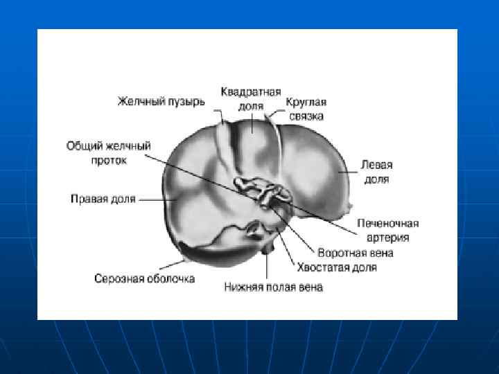 Строение печени Расположена печень непосредственно под диафрагмой, в верхней части брюшной полости справа. На печени различают две поверхности и два края. Верхняя поверхность выпукла соответственно вогнутости диафрагмы, к которой она прилежит. Нижняя поверхность обращена вниз и назад и несет на себе ряд вдавлений от брюшных внутренностей, к которым она прилежит. В печени различают две доли: правую и меньшую левую, которые на диафрагмальной поверхности отделены друг от друга серповидной связкой печени.