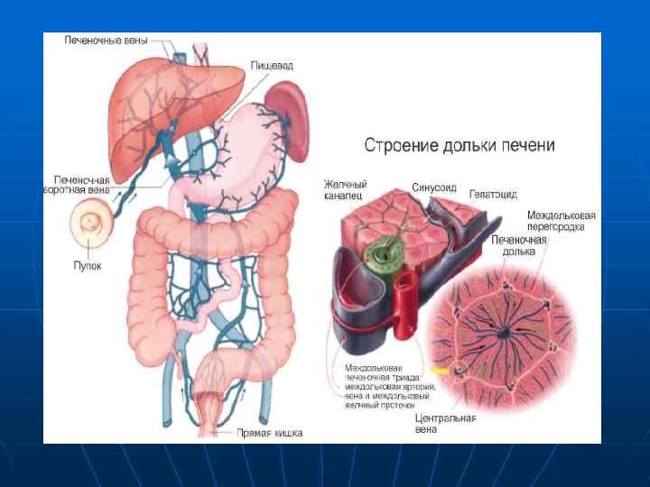 Печеночные дольки снабжаются кровью от ветвей воротной вены и печеночной артерии, а образующаяся в дольках желчь поступает в систему канальцев, из них – в желчные протоки и выводится из печени. Воротная вена печени и печеночная артерия обеспечивают печень необычным, двойным кровоснабжением. Обогащенная питательными веществами кровь из капилляров желудка, кишечника и нескольких других органов собирается в воротную вену, которая вместо того, чтобы нести кровь к сердцу, как большинство других вен, несет ее в печень. В дольках печени воротная вена распадается на сеть капилляров (синусоидов). Термин «воротная вена» указывает на необычное направление транспорта крови из капилляров одного органа в капилляры другого (сходную систему кровообращения имеют почки и гипофиз).
