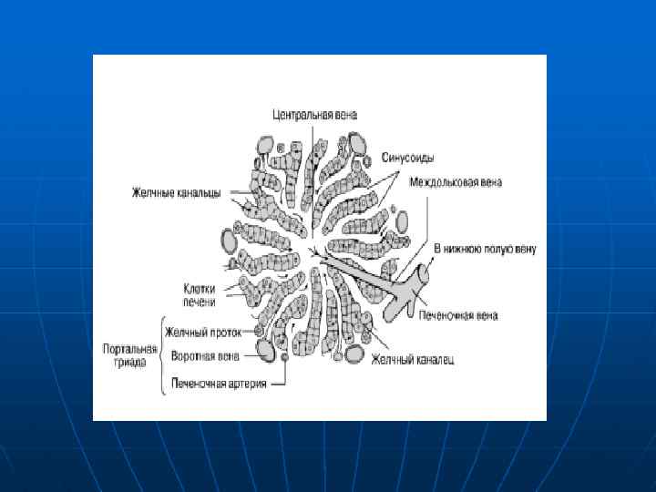 Сложная структура печени прекрасно приспособлена для выполнения ее уникальных функций. Две большие доли состоят из мелких структурных единиц – долек. В печени человека их насчитывается около ста тысяч, каждая 1, 5– 2 мм длиной и 1– 1, 2 мм шириной. Долька состоит из печеночных клеток – гепатоцитов, расположенных вокруг центральной вены. Гепатоциты объединяются в слои толщиной в одну клетку – т. н. печеночные пластинки. Они радиально расходятся от центральной вены, ветвятся и соединяются друг с другом, формируя сложную систему стенок; узкие щели межу ними, наполненные кровью, известны под названием синусоидов. Синусоиды эквивалентны капиллярам; переходя один в другой, они образуют непрерывный лабиринт.