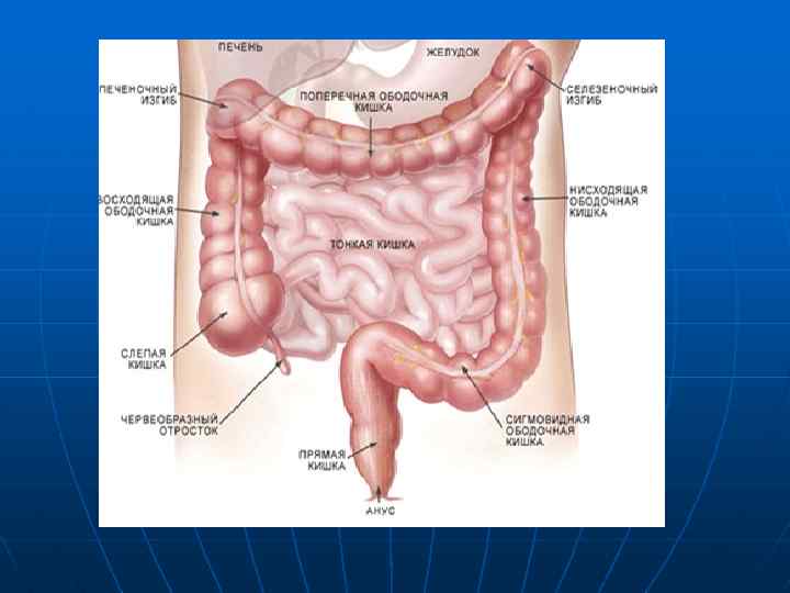 Толстый кишечник имеет несколько отделов: n слепая кишка длина 1 13 см; это участок толстого кишечника ниже впадения подвздошной кишки, то есть ниже илеоцекального клапана. От места схождения трех лент отходит червеобразный отросток (аппендикс), который может быть направлен не только вниз, но и в любую другую сторону. n восходящая ободочная кишка n поперечная ободочная кишка n нисходящая ободочная кишка n сигмовидная кишка - длина очень изменчива, до 80 90 см. n прямая кишка: длина 12 15 см. Болезнями этой кишки занимаются врачи отдельной специальности — проктологи (от греч. proktos задний проход). Воспаление толстого кишечника называется колит. Воспаление прямой кишки должно называться проктит, но такой термин редко употребляется. Чаще используется парапроктит — воспаление клетчатки вокруг прямой кишки (пара около).