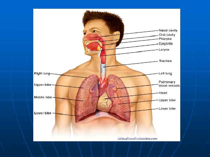 Лекция Анатомия системы дыхания n n n Дыхательная система человека совокупность органов, обеспечивающих в организме человека внешнее дыхание, или обмен газов между кровью и внешней средой и ряд других функций Газообмен выполняется лёгкими, и в норме направлен на поглощение из вдыхаемого воздуха кислорода и выделение во внешнюю среду образованного в организме углекислого газа. Кроме того, дыхательная система участвует в таких важных функциях, как терморегуляция, голосообразование, обоняние, увлажнение вдыхаемого воздуха.