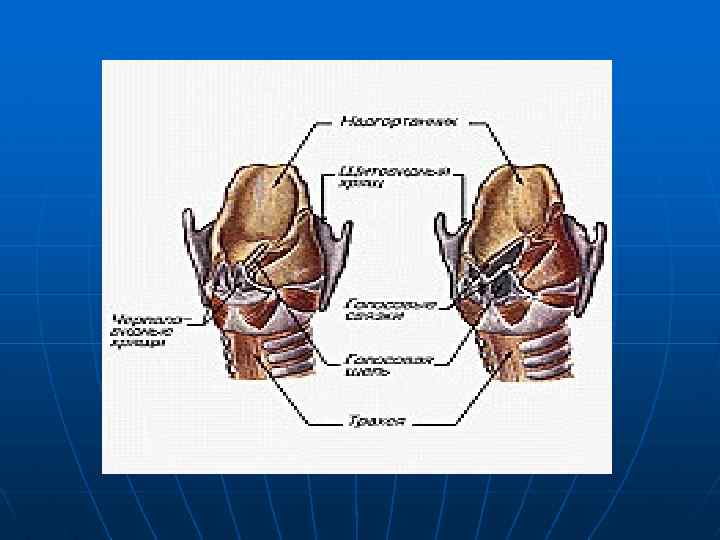 Гортань - орган голосообразования n Вход в трахею начинается через гортань. Она представляет собой широкую трубку, суженную посередине и напоминающую песочные часы. Гортань состоит из хрящей. Спереди и с боков ее прикрывает щитовидный хрящ. У мужчин он несколько выступает вперед, образуя кадык. В узкой части гортани находятся голосовые связки. Их две пары, но в голосообразовании участвует лишь одна, нижняя пара. Связки могут сближаться и натягиваться, то есть изменять форму щели, которая образуется между ними. Когда человек спокойно дышит, связки разведены. При глубоком дыхании они разводятся еще дальше, при пении и речи они смыкаются, остается лишь узкая щель, края которой вибрируют. Они то и являются источником звуковых колебаний, от которых зависит высота голоса. У мужчин связки длиннее и толще, их звуковые колебания ниже по частоте, поэтому и мужской голос более низкий. У детей и женщин связки тоньше и короче, а потому их голос более высокий.