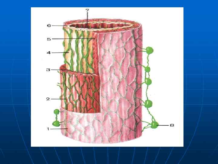 Воспаление 12 перстной кишки называется дуоденит. На практике воспаление тощей и подвздошной кишок отдельно не выделяют, а называют общим термином энтерит (воспаление тонкого кишечника) от греческого enteron кишечник. Типичное микроскопическое строение кишечной стенки (изнутри кнаружи): n n n слизистая оболочка, подслизистая основа, мышечный слой: внутренний циркулярный (круговой), наружный продольный (в толстом кишечнике от него остаются лишь три ленты, о них ниже), серозный (наружный) слой.