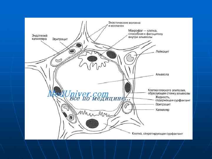 n n Стенки альвеол — это та поверхность, на которой происходит газообмен. В легких человека имеется до 700 миллионов альвеол с обшей площадью поверхности 70— 90 кв. м. Толщина альвеолярной стенки составляет всего лишь около 0, 0001 мм (0, 1 мкм). Наружная сторона альвеолярной стенки покрыта густой сетью кровеносных капилляров; все они берут начало от легочной артерии и в конце концов объединяются, образуя легочную вену. Каждая альвеола выстлана влажным плоским эпителием. Клетки его уплошены, что делает еще более тонким барьер, через который диффундируют газы. В альвеолярной стенке присутствуют также коллаген и эластические волокна, придающие ей гибкость и позволяющие альвеолам изменять свой объем при вдохе и выдохе.
