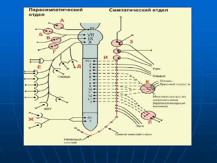 Симпатические и парасимпатические центры находятся под контролем координирующих их функцию гипоталамических центров, а также коры больших полушарий головного мозга, которая посредством вегетативной нервной системы осуществляет целостное реагирование организма на различные воздействия, а также поддержание соответственно текущим потребностям уровня интенсивности основных жизненных процессов. Парасимпатические нервы (ПНС) выходят из среднего и продолговатого мозга, а также из крестцовой части спинного мозга, прерываясь далеко на периферии в узлах у иннервируемого органа или внутри него. Симпатические нервы (СНС) выходят из спинного мозга в области 1 -го грудного - 4 -го поясничного сегментов, прерываются в узлах пограничного симпатического ствола или в несколько дальше расположенных ганглиях, откуда распространяются по всему телу. Соответственно этому в ПНС постганглионарные волокна короткие, а в СНС более длинные. Поэтому результаты раздражения СНС всегда носят более распространённый, диффузный характер, тогда как проявления ПНС более локальны, захватывают один какой либо орган.