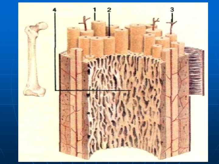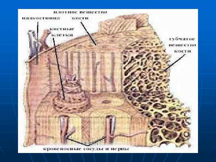 Структурной единицей кости, видимой в лупу или при малом увеличении микроскопа, является остеон, или гаверсова система, т. е. система костных пластинок, концентрически расположенных вокруг канала (гаверсова канала), содержащего сосуды и нервы. Остеоны не прилегают друг к другу вплотную, а промежутки между ними заполнены промежуточными или вставочными (интерстициальными) костными пластинками. Остеоны располагаются не беспорядочно, а соответственно функциональной нагрузке на кость: в трубчатых костях параллельно длиннику кости, в губчатых — перпендикулярно вертикальной оси, в плоских костях черепа — параллельно поверхности кости и радиально. Вместе со вставочными пластинками остеоны образует основной средний слой костного вещества, покрытый изнутри (со стороны эндоста) внутренним слоем общих, или генеральных, костных пластинок, а снаружи (со стороны периоста) — наружным слоем общих, или генеральных, пластинок. Последний пронизан кровеносными сосудами, идущими из надкостницы в костное вещество в особых каналах, называемых фолькмановскими.