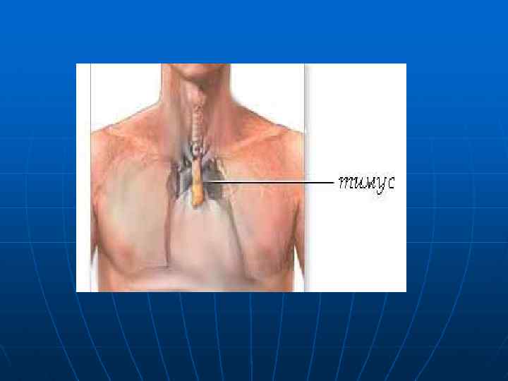 Тимус (вилочковая железа) Вилочковую железу еще называют тимусом или зобной железой. Она, как и костный мозг, является центральным органом иммуногенеза (формирование иммунитета). Тимус распологается непосредственно за грудиной и состоит из двух долей (правой и левой), соединенных рыхлой клетчаткой. Тимус формируется раньше других органов иммунной системы, масса его у новорожденных 13 г. , наибольшую массу около 30 г тимус имеет у детей 6 15 лет. Затем он претерпевает обратное развитие (возрастная инволюция) и у взрослых почти полностью замещается жировой клетчаткой (у людей старше 50 лет жировая ткань составляет 90% от общей массы тимуса (в среднем 13 15 гр. ). С деятельностью тимуса связан период наиболее интенсивного роста организма. В тимусе находятся малые лимфоциты (тимоциты).