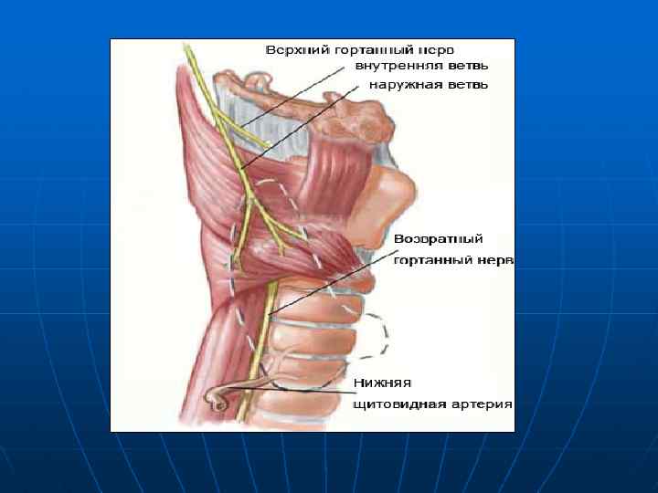 Обозначения на рисунке: 1 -щито-подъязычная мышца; 2 -пирамидальная доля щитовидной железы; 3 -верхняя щитовидная артерия; 4 -левая доля щитовидной железы; 5 -перешеек щитовидной железы; 6 -нижняя щитовидная вена; 7 -трахея; 8 -нижняя щитовидная артерия; 9 -непарная щитовидная вена; 10 -правая доля щитовидной железы; 11 -верхняя щитовидная вена; 12 -щитовидный хрящ; 13 -верхняя гортанная артерия; 14 -подъязычная кость.