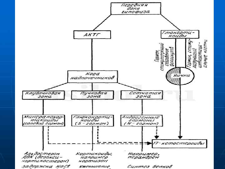 Корковое вещество надпочечника делится на зоны: n клубочковую, n пучковую n сетчатую. Гормоны коркового вещества кортикостероиды (глюкои минералокортикоиды) синтезируются в митохондриях секреторных клеток из холестерина. Обеспечивают процесс адаптации к различным стрессам, посредством регуляции обмена веществ, сосудистого тонуса, иммунитета и др. В клубочковой зоне коркового вещества синтезируется альдостерон основной минералокортикоид, участвующий в регуляции водносолевого обмена. В пучковой зоне синтезируется преимущественно кортизол глюкокортикоид, влияющий на белковый, жировой и углеводный обмен и на обмен нуклеиновых кислот, и кортикостерон, обладающий свойствами глюко и минералокортикоида. В сетчатой зоне образуются половые гормоны, главным образом андрогены. Синтез кортикостероидов регулируются адренокортикотропным гормоном (Гипофиз).