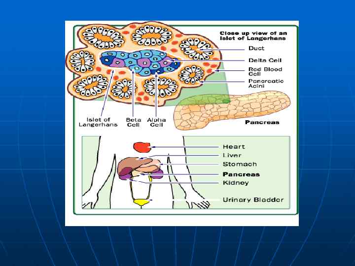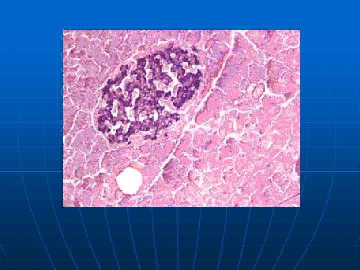 Поджелудочная железа состоит из эндокринной и экзокринной частей. Эндокринная часть образована группами панкреатических островков (островки Лангерганса), которые сформированы клеточными скоплениями, окружёнными густыми капиллярными сетями. Общее количество островков колеблется в пределах от одного до двух млн. Клетки островков содержат множество покрытых мембранами гранул. Преобладают b-клетки (60 -80%), которые секретируют инсулин, наряду с ними a-клетки (10 -30%), вырабатывающие глюкагон. D-клетки (около 10%) синтезируют соматостатин - угнетает выработку гипофизом гормона роста и выделение инсулина и глюкагона b и a клетками. Многочисленные b клетки занимают внутреннюю часть островка. Альфа клетки у человека распологаются группами по всему островку.
