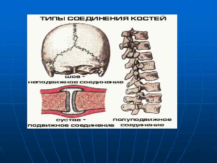 220 костей в нашем теле – это еще не скелет. Единое целое они будут представлять в соединении. Способ соединения костей зависит от их функций. Различают: 1. Непрерывные соединения костей; 2. Прерывные соединения костей(суставы); 3. Полусуставы. Непрерывные соединения костей имеются между костями черепа, таза. Между соединяющимися костями расположена тонкая прослойка соединительной ткани или хряща. Соединения костей крыши и лицевого отдела черепа называют швами. Выделяют зубчатые швы, когда зубчатой формы край одной кости крыши черепа соединяется с аналогичным краем другой кости. Полусуставы также представляют собой хрящевые соединения, но в толще хряща имеется небольшая полость. К ним относятся соединения позвонков, лобковых костей. Небольшая подвижность этих соединений достигается при помощи хрящевых пластинок и упругих связок.