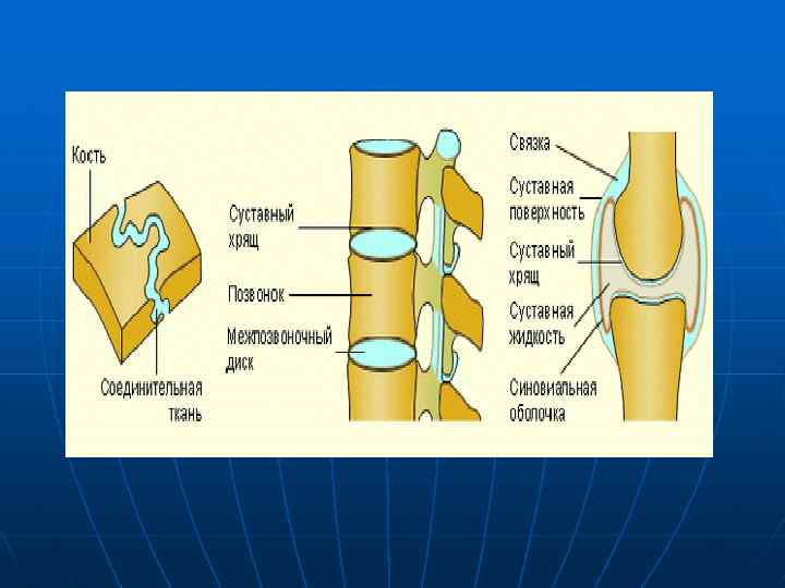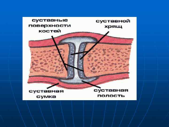 Суставы непрерывные соединения костей, включающие следующие элементы: 1. суставные поверхности костей, покрытые хрящом; 2. суставную капсулу, или сумку; 3. суставную полость; 4. полостную жидкость. Сустав обычно укреплен связками. Суставная жидкость продуцируется клетками, выстилающими внутреннюю поверхность суставной сумки. Жидкость облегчает скольжение суставных поверхностей костей и служит питательной средой для суставного хряща. Количество полостной жидкости, заполняющей узкую щель между суставными поверхностями, очень невелико.