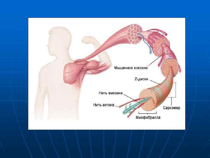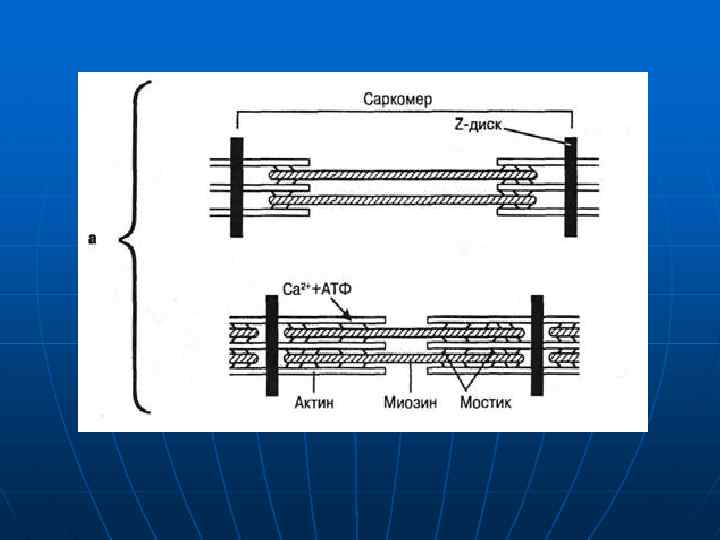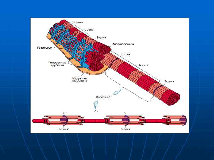 Каждая миофибрилла имеет периодическое строение. Повторяющаяся структура в составе миофибриллы называется саркомером. Саркомеры соседних миофибрилл расположены друг против друга, отчего все мышечное волокно тоже приобретает периодическое строение. Граница между двумя саркомерами имеет вид темной полосы на электронно микроскопических фотографиях и носит название Z диска. В Z диске локализуется белок альфа актинин , который необходим для прикрепления актиновых филаментов к Z диску. От Z диска перпендикулярно ему отходят нити F актина , ассоциированные с тропомиозином и тропонином.