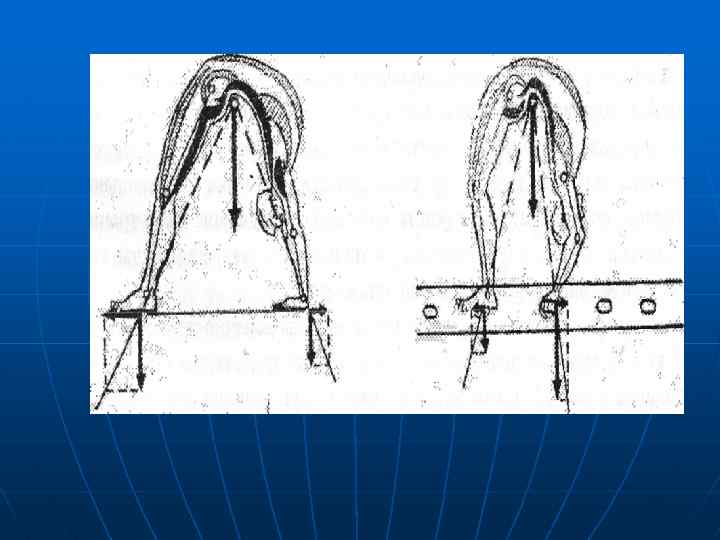 Из внешних сил на тело действуют не только сила тяжести и вертикальная составляющая реакции опоры, но также сила трения, от величины которой зависит как характер работы двигательного аппарата (в частности, сте пень напряжения мышц), так и характер выполнения самого упражнения. Из внутренних сил, способствующих сохранению равновесия тела в данном положении, определенное значение имеет сила эластической тяги, возникающая при растягивании мышц, связок, суставной сумки хрящей и т. п. Общий центр тела расположен вне тела, несколько ниже поясничного отдела позвоночного столба.