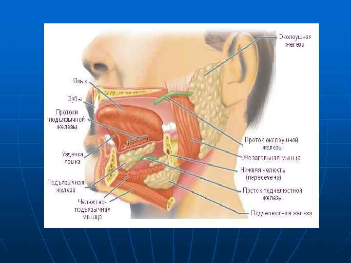 В ротовую полость открываются протоки трех пар крупных слюнных желез и большого числа мелких, расположенных в слизистой оболочке ротовой полости. Секреция слюны в ротовой полости регулируется двумя рефлексами: условным и безусловным. Безусловный рефлекс возникает при наличии пищи во рту, условный вызывается видом, запахом и вкусом пищи. Рефлекторное выделение слюны доказал И. П. Павлов, наложив фистулу выводного протока слюнной железы. В состав слюны входят неорганические вещества: вода, мениральные соли (ионы натрия, калия, хлора и т. д. ) и органические вещества, главным образом белки слюны: лизоцим (обеззараживающее вещество слюны), муцин (вещество белковой природы, участвующее в образовании пищевого комка), птиалин и мальтаза (ферменты, расщепляющие крахмал в сололдовый сахар и далее в глюкозу). К С. Железам относятся три пары желез: околоушная железа, подчелюстная и подъязычная, из которых первые располагаются снаружи, а последняя внутри полости рта.