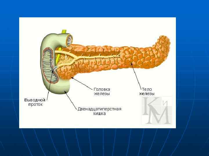 ПОДЖЕЛУДОЧНАЯ ЖЕЛЕЗА Вторая по величине железа пищеварительной системы. Её масса 60 100 г. Железа имеет серовато –красный цвет, дольчатая. Крупная пищеварительная железа обладает внешнесекреторной и эндокринной функциями. Расположена она в забрюшинном пространстве, в верхней части живота, лежит поперечно по отношению к позвоночнику на уровне 1 и 2 го поясничных позвонков. Панкреас вытянута в виде тяжа длиной 15 25 см, шириной 3 9 см и толщиной 2 3 см. Состоит из трех структурных компонентов : головку, тело и хвост. Головка наиболее утолщенная часть, соприкасается с двенадцатиперстной кишкой. Тело выглядит в виде призмы спереди покрыто брюшиной, хвост наиболее суженная часть подходит к воротам селезенки. Ткань поджелудочной железы имеет альвеолярно трубчатое строение, она разделена соединительной тканью на дольки. В дольках расположены ацинусы клетки вырабатывающие поджелудочный сок. Протоки долек сливаются в более крупные и, наконец, в общий выводной проток.