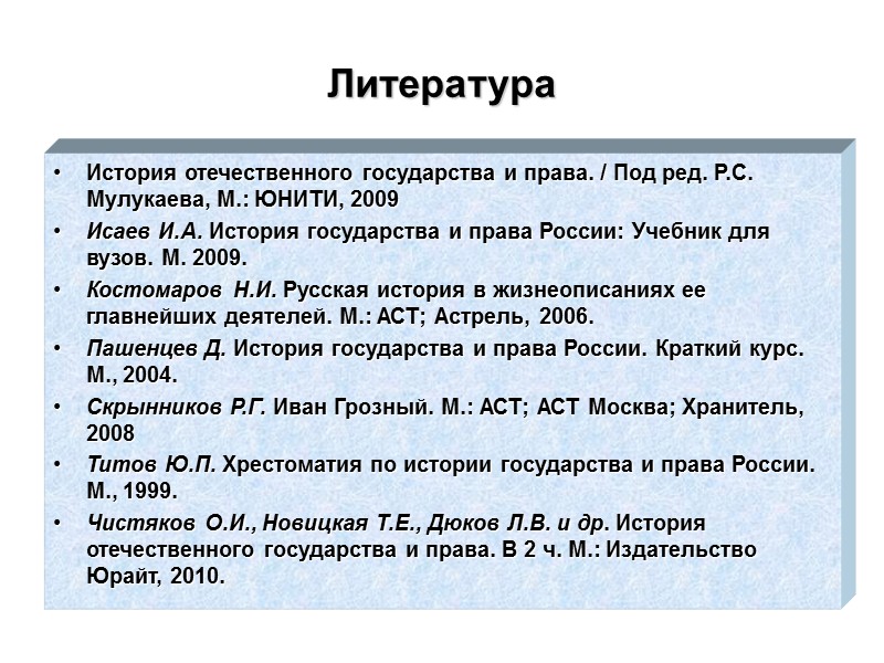 Литература История отечественного государства и права. / Под ред. Р.С. Мулукаева, М.: ЮНИТИ, 2009 Исаев И.А. История государства и права России: Учебник для вузов. М. 2009. Костомаров Н.И. Русская история в жизнеописаниях ее главнейших деятелей. М.: АСТ; Астрель, 2006. Пашенцев Д. История государства и права России. Краткий курс. М., 2004. Скрынников Р.Г. Иван Грозный. М.: АСТ; АСТ Москва; Хранитель, 2008 Титов Ю.П. Хрестоматия по истории государства и права России. М., 1999. Чистяков О.И., Новицкая Т.Е., Дюков Л.В. и др. История отечественного государства и права. В 2 ч. М.: Издательство Юрайт, 2010.