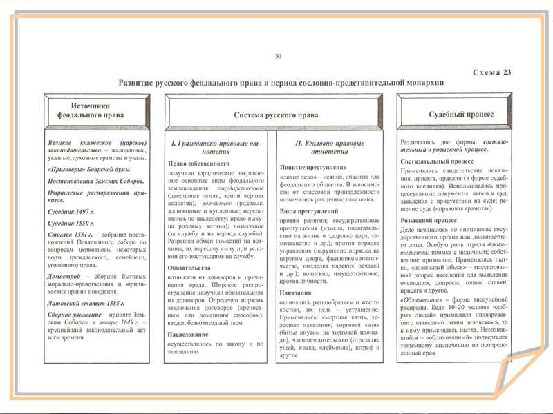 Соборное Уложение 1649 г. Собо́рное уложе́ние 1649 года — свод законов Русского государства, первый в русской истории нормативно-правовой акт, охвативший все действующие правовые нормы, включая и так называемые «новоуказные» статьи. Принято на Земском соборе 1649 года и действовало вплоть до 1832 года. Соборное уложение состоит из 25 глав, регулирующих различные области жизни. Источниками Соборного Уложения был как русское, так и зарубежное законодательство. Указные книги приказов. Судебник 1497 года и Судебник 1550 года. Литовский статут 1588 года — был использован, как образец юридической техники.