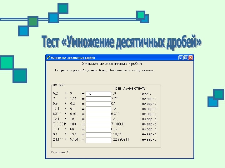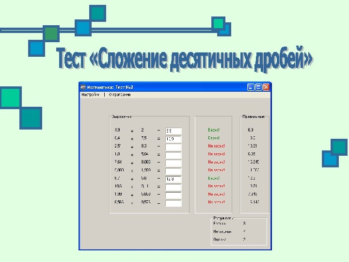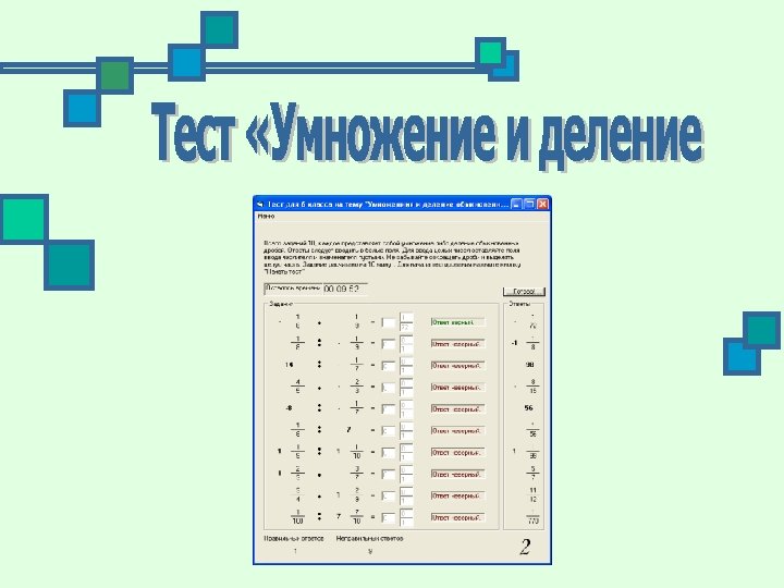 n n n многократное использование без повторений заданий, ограничение работы по времени, автоматическая проверка результатов, показ правильных ответов, автоматическое выставление оценки.
