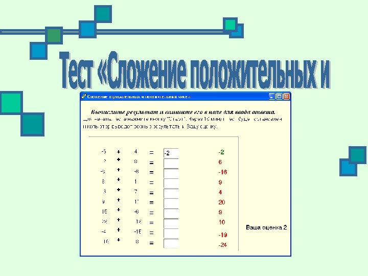 Программа «Сложение и вычитание положительных и отрицательных чисел» направлена на проверку и улучшение навыков сложения и вычитания положительных и отрицательных чисел у учеников шестых классов средней школы. В программе использованы функции случайных чисел для реализации вариативности заданий.
