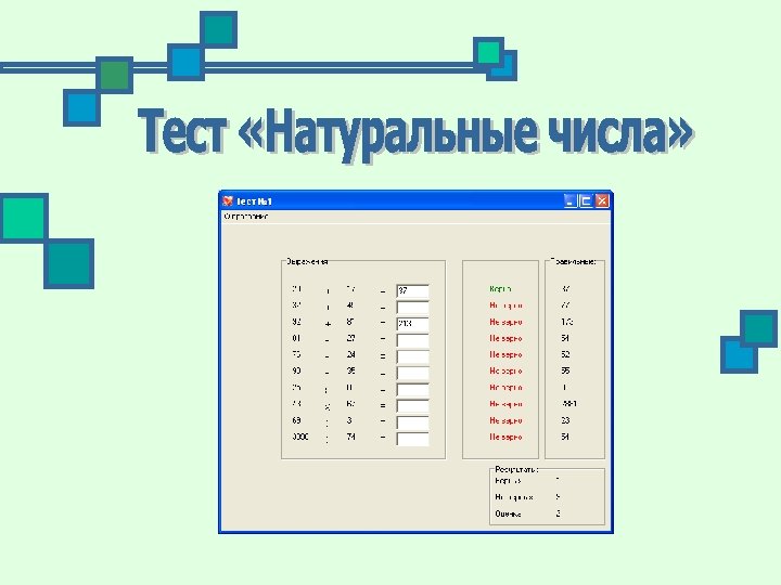 Программа «Натуральные числа» направлена на проверку и улучшение навыков ряда действий натуральных чисел у учеников шестых классов средней школы. В программе использованы функции случайных чисел для реализации вариативности заданий.
