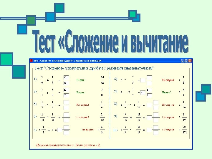 Программа «Сложение и вычитание дробей с разными знаменателями» позволяет лучше развить или проверить уже существующие вычислительные навыки учеников шестых классов средних школ. В программе использованы логарифм Евклида нахождения наибольшего общего делителя и выделение целой части.