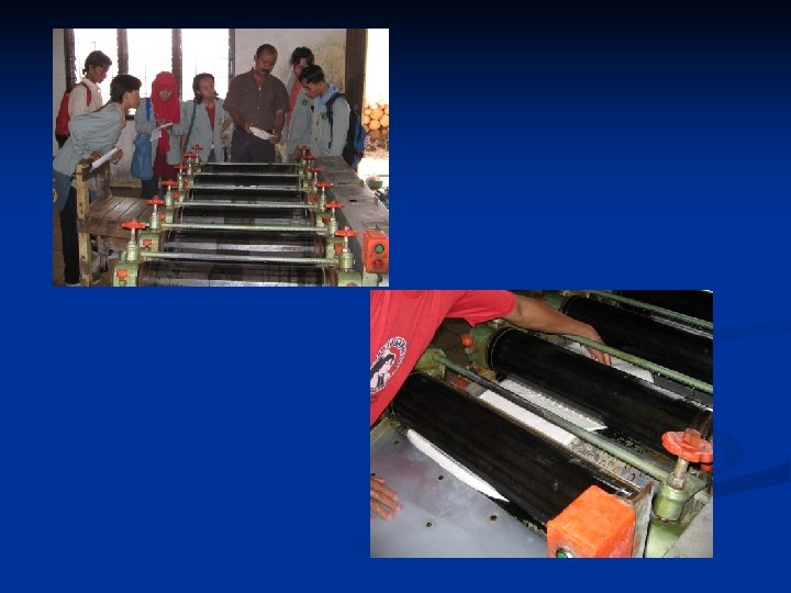 E. TAHAP PENGGILINGAN BEKUAN LATEK Pada tahap penggilingan bekuan latek ini menggunakan mesin penggiling yang disebut baterai sheet yang terdiri dari 5 – 6 rol per unit, dimana pada rol terakhir diberi cetakan atau printer yang berguna untuk memperluas permukaan sheet sehingga akan membantu mempercepat dalam pengeringan karena permukaan sheet akan lebih luas untuk menguapkan air. Selama penggilingan sheet air terus dialirkan. Adapun maksud penggilingan bekuan latek ini adalah: 1. Untuk mengeluarkan air dari bekuan latek. 2. Untuk menghilangkan serum-serum dan 3. menipiskan bekuan menjadi kurang lebih 0, 2 cm ketebalannya. Selanjutnya lembaran sheet yang terbentuk direndam dan dicuci dalam bak air dengan maksud untuk menghilangkan sisa-sisa serum dan sisa asam semut. Lembaran sheet ditiriskan dengan menggantung lembaran-lembaran sheet mentah tersebut sekitar kurang lebih selama 2 jam, untuk siap dimasukkan ruang pengasapan.