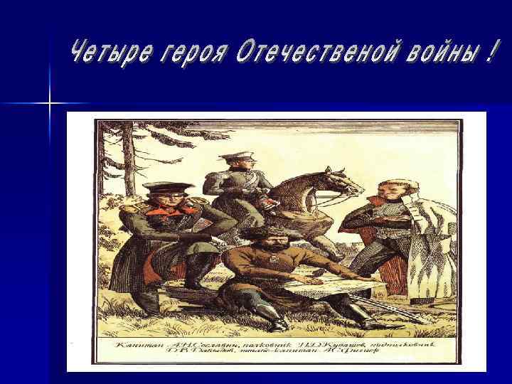 ДАВЫДОВ ДЕНИС ВАСИЛЬЕВИЧ (1784 - 1839) Адъютант Багратиона, подполковник Ахтырского гусарского полка, возглавил летучий партизанский отряд, действовавший в тылу Наполеона. Нападал на обозы, перехватывал курьеров, уничтожал шайки мародёров.