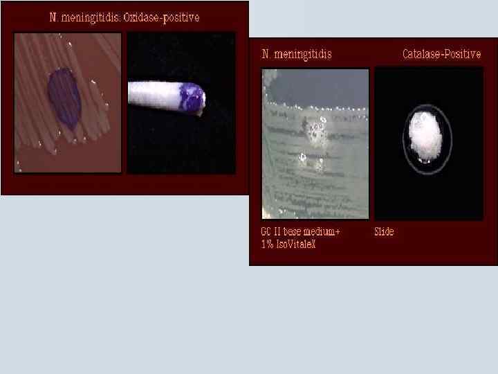 Neisseria meningitidis Биохимически малоактивны n Растут на обогащенных питательных средах: кровяной агар, шоколадный агар в атмосфере 5 -10% углекислого газа n мало устойчивы к внешним воздействиям. Прямые солнечные лучи, температура ниже 22°, высыхание, действие дезинфицирующих средств приводят к его быстрой гибели. n N. Meningitidis рост на шоколадном агаре
