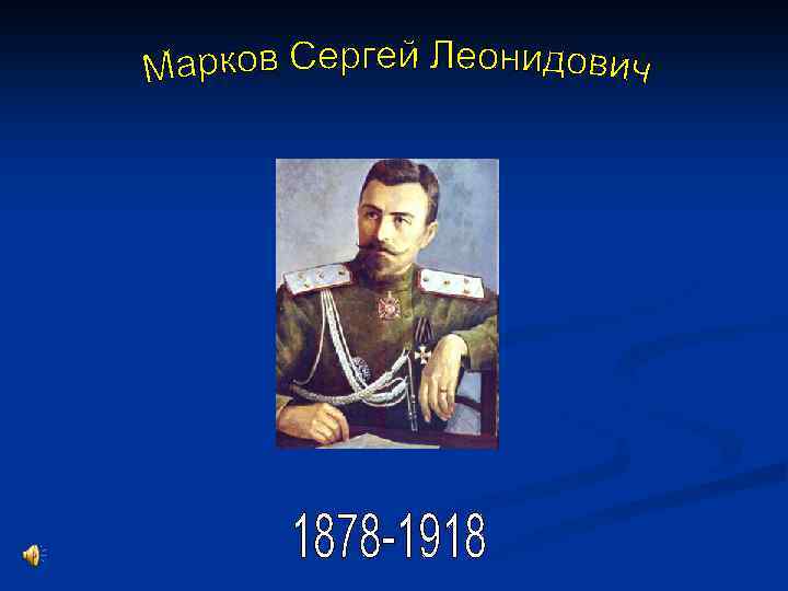 n Сергей Леонидович Марков (7 июля 1878, Санкт-Петербургская губерния — 25 июня 1918, станица Мечетинская Кубанской области) — российский военачальник, Генерального штаба генерал-лейтенант (1917 г. ). Участник Русско-японской, Первой мировой и Гражданской войн. Первопоходник. Один из вождей Белого движения на Юге России и организаторов Добровольческой армии. Кавалер ордена Святого Георгия 4 -й степени, орденов Святого Владимира 3 -й степени и 4 -й степени с мечами и бантом, орденов Святой Анны 2 -й, 3 -й и 4 -й степеней, орденов Святого Станислава 2 -й и 3 -й степеней. Обладатель Георгиевского оружия. n Родился в семье офицера, потомственного дворянина Московской губернии. Брат — подпоручик 86 -го Вильманстрандского полка Леонидович Марков — участвовал в русско-японской войне и умер от ран в 1904. n С. Л. Марков был женат на Марианне Павловне, урождённой княжне Путятиной, и имел двух детей — сына Леонида (родился в 1907) и дочь Марианну (родилась в 1909). В 1920 семья эмигрировала, после Второй мировой войны жила в Бельгии, а в 1950 -е годы дети генерала Маркова переехали в США. Окончил 1 -й Московский кадетский корпус (1895), Константиновское артиллерийское училище (1898), Николаевскую академию Генерального штаба (1904). В 1898 -1901 (до поступления в академию) служил в лейбгвардии 2 -й артиллерийской бригаде. С 1898 — подпоручик, с 1902 — поручик, с 1904 — штабс-капитан.