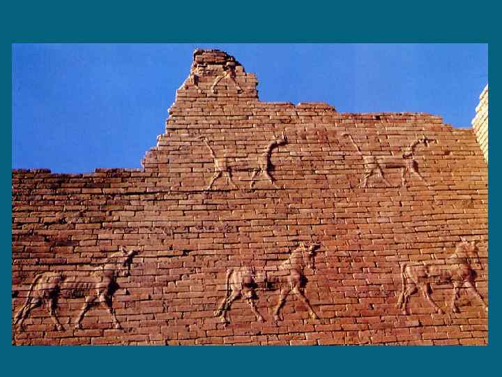 Изразцовая облицовка стены тронного зала дворца Навуходоносора II из Вавилона. VI в. до н. э. Фрагмент n Навуходоносор II построил в Вавилоне огромный дворец с висячими садами царицы Семирамиды, который греки считали одним из семи чудес света. Лучше всего сохранился тронный зал дворца, стены его были декорированы великолепно стилизованным глазурованным кирпичом. В нижней части стены находился фриз со львами, в центре были изображены колонны, украшенные завитками, образующими цветочные фризы, колонны со всех четырех сторон обрамлялись бордюрами с растительным орнаментом.
