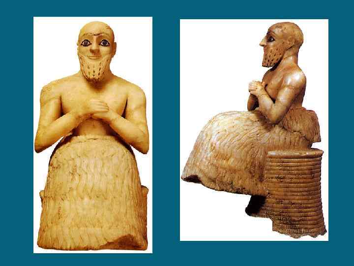 Статуя сановника Эбих-Иля из Мари. Сер. III тыс. до н. э. n Стиль скульптурных мастерских в Мари напоминает утонченную лепку из мягкой глины. Типичным примером может служить статуя сановника Эбих. Иля из Мари. Лицо сановника озарено мягкой улыбкой, огромные глаза смотрят внимательно и напряженно, подбородок четко отделен от груди. С тщательностью выполнены все детали, особенно в одежде, которая представляет собой юбку овечьей шерсти с вырезанными поштучно прядями или клоки бороды с вьющимися кончиками. Руки вырезаны мягко, мускулатура скрыта.