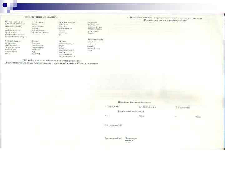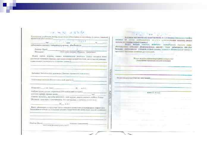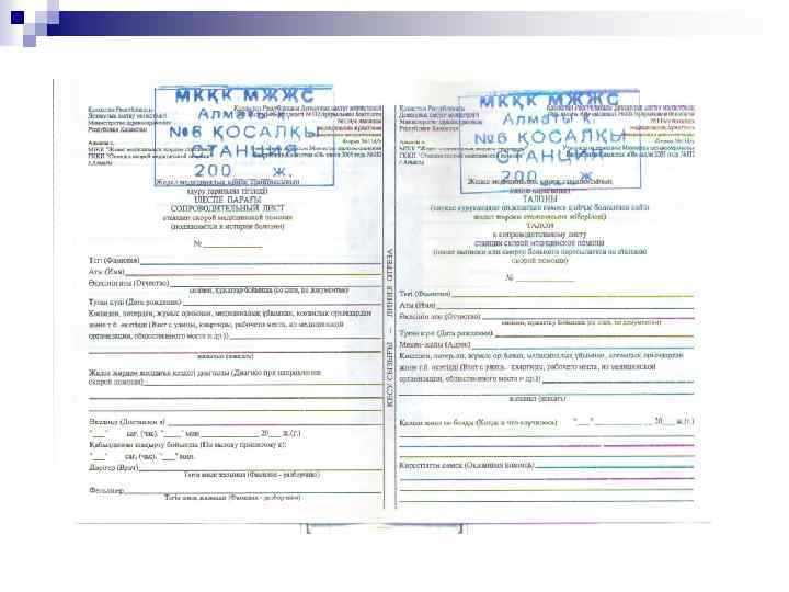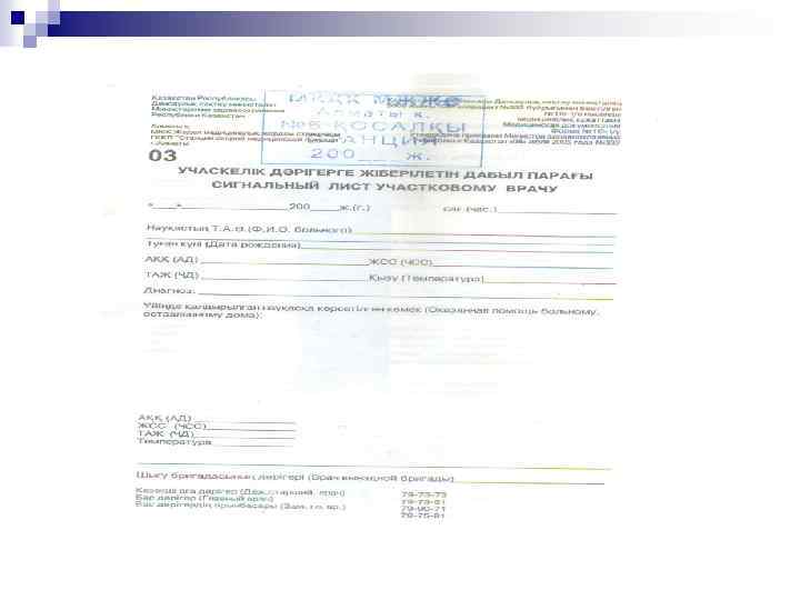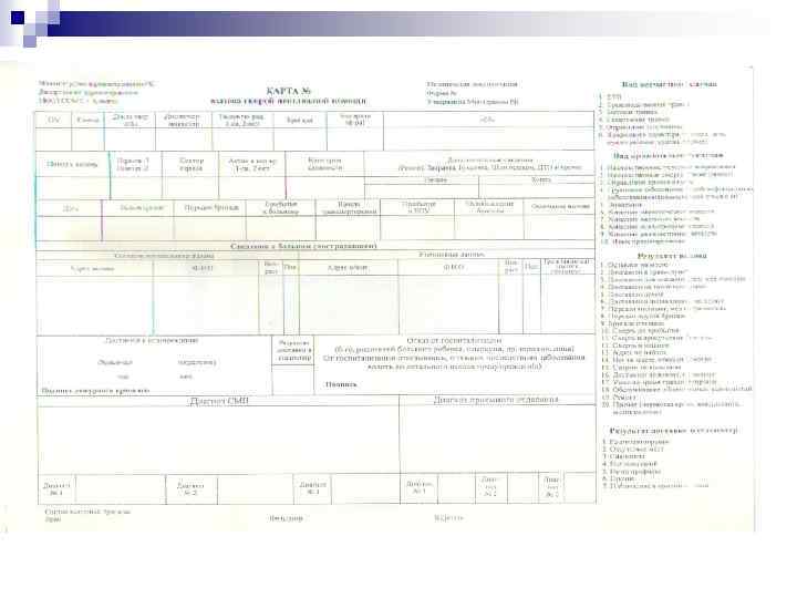 Жедел жәрдем бекетінің негізгі тіркеу – есеп беру құжаты n n n Шақырту картасы. Науқастың мекен-жайы, жасы, шақырту себебі толтырылады. Шақыруды қабылдау уақыты, оны қосалқы бекетпен бригадаға беру уақыты « 03» диспетчерімен белгіленеді, дәрігер науқасқа келу және кету уақытын тіркейді. Науқасқа келген кезде науқастың құжаттық мәліметтері толықтырылып, шағымдары, диагноз, жүргізілген ем, қай ауруханаға және қай бөлімге жатқызылғаны жазылады. ЖМК шақырту қағазында бригаданың құрамы (дәрігер, фельдшер, жүргізуші) жазылады. Қылмысты сипаттағы шақыртуларға барған кезде (апат, пышақты жарақаттар, ұру-соғу, жол-көлік апаттары, өрт, өзөзін өлтіру және т. б) өлген науқастар туралы мәліметтер сәйкес орындарға хабарландырылады, шақырту қағазын хабарламаны қабылдаған адам өз фамилиясын жазып, толтырады.