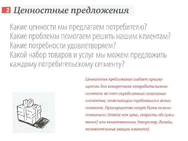 Формирование Ценностного Предложения • Правильное предложение нельзя сформировать у себя в кабинете ! • Надо идти к клиентам и общаться с ними Свойства вашего продукта Важность Необходимость Частота использования Свойство 1 Важно/не очень Нужно/неплохо Часто/редко бы иметь Свойство 2 Важно/не очень Нужно/неплохо Часто/редко бы иметь Свойство 3 Важно/не очень Нужно/неплохо Часто/редко бы иметь