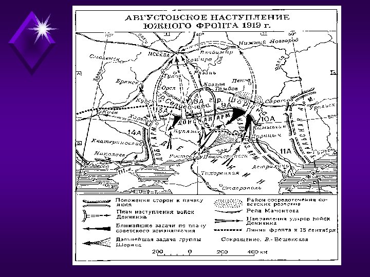u u u 1919 г. - переломный год – интервенты стали покидать советскую Россию. Октябрь 1919 – наступление Красной армии. 1 –ая Конная армия С. Будённого остановило наступление под Тулой. Стремительное наступление разделило Добровольческую армию на 2 части. Декабрь 1919 г. – нач. 1920 г. – армия Деникина была разбита. Войска Деникина отступили в Крым. Где командование над ними принял барон Врангель (апрель 1920).