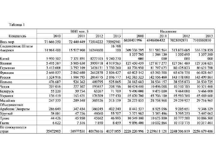 На основании представленных данных в таблице 1: 1. Провести структурно-динамический анализ ВВП и населения 2. Рассчитать объем ВВП на душу населения 3. Разбить исследуемые страны на группы по степени развитости рыночной экономики 4. Сделать аналитическое сравнение и выводы по полученным данным.