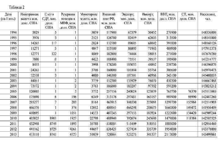 На основании представленных данных в таблице 2 рассчитать: 1. Валютные резервы. 2. Международные резервы (золотовалютные резервы). 3. Цепные темпы роста: внешнего долга, импорта, международных резервов. 4. Превышение резервов над суммой импорта. 5. Доля валютных резервов в общей их величине, % 6. Квд/э, Квдв/вп, НОД, МВЛ. 7. Внешний долг на душу населения, долл. США. 8. Отношение международных резервов и внешнего долга (ВР/ВД), %. 9. По результатам расчетов сделать соответствующие выводы.