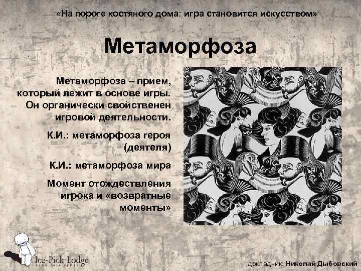 «На пороге костяного дома: игра становится искусством» Метаморфоза – прием, который лежит в основе игры. Он органически свойственен игровой деятельности. К. И. : метаморфоза героя (деятеля) К. И. : метаморфоза мира Момент отождествления игрока и «возвратные моменты» докладчик: Николай Дыбовский